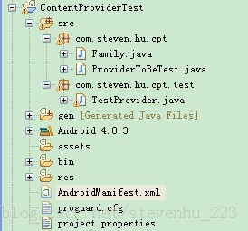 ProviderToBeTest为被测试的ContentProvider组件。在ProviderToBeTest的Android工程中建立两个不同的包名,分别存放被测试代码文件和测试代码文件。如下结构: