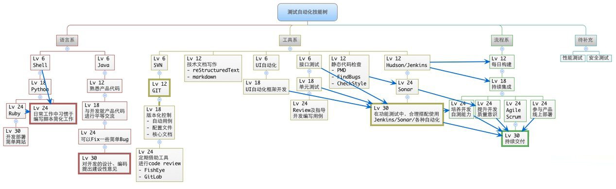 仿照《Diablo2》的技能树系统,结合自己的一些经验体会,整理了一份测试自动化的技能树,仅供参考,大家轻拍~