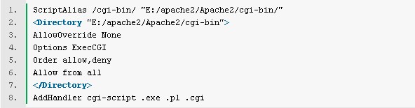 其中E:/apache2/Apache2/cgi-bin/要改成你准本放cgi程序的目录。修改好httpd.conf后可能需要重启Apache服务器