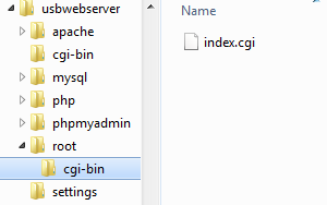 好把刚才生成的cgi程序(.exe文件),复制放到上文中提到的/cgi-bin/目录下,文件名好改成index.cgi这样的形式。对于USBWebSever,cgi-bin目录应该是root目录下的cgi-bin目录(如果没有要新建一个),不是和USBWebSever在同一目录下的cgi-bin目录。我的目录结构是这样的