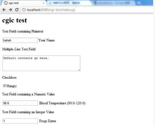 打开浏览器输入http://localhost:8080/cgi-bin/index.cgi(地址取决于你自己的具体设置),可以看到cgi程序已经运行了。