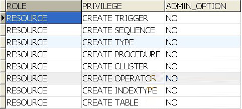 | select * from role_sys_privs where role=’RESOURCE’ |