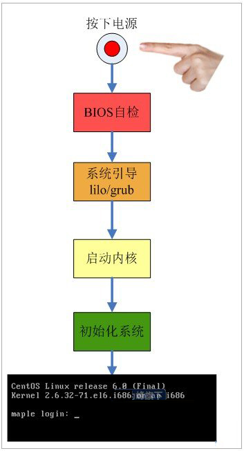 OK,我们言归正传。对于一台安装了Linux系统的主机来说,当用户按下开机按钮时,一共要经历以下几个过程,如图: