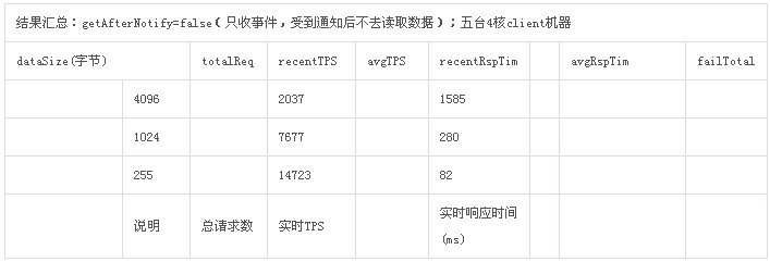 结果汇总:getAfterNotify=false(只收事件,受到通知后不去读取数据);五台4核client机器