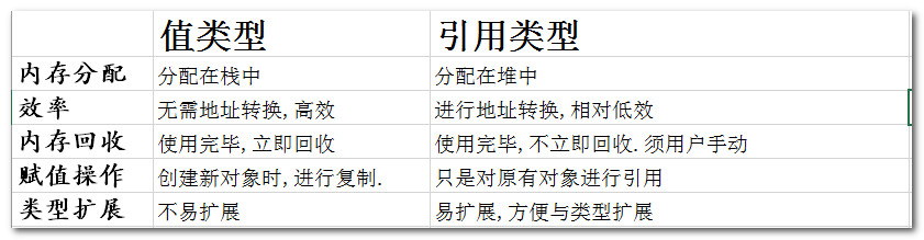 值类型的变量包含自身的数据,而引用的数据类型包含指向数据的内存块引用。读到这里,让我想起了VB时代里,byref和byval。这两种不同的传值方式。接着来说值类型和引用类型,值类型对于每个变量都有一份自己的数据拷贝,则在使用数据的时候,不会因为对一个数据的操作去影响另一个数据;而在引用类型中,可以通过对一个变量的操作来影响另一个变量的引用的对象。