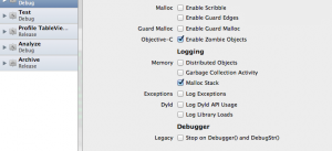 然后按图勾上Enable Zombie Objects和Malloc Stack那两项,记住一般只有在定位EXC_BAD_ACCESS时候才勾选,别有事没事都勾上。