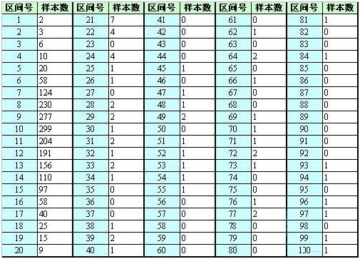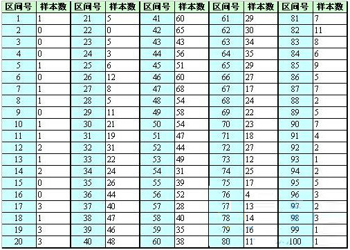不难发现区间1-20之间有显著的规律性。这20个区间一共包含了1934个样本,占样本总数的96.7%,将这些样本按其区间间隔再次分为100个区间,则可以得到下表: