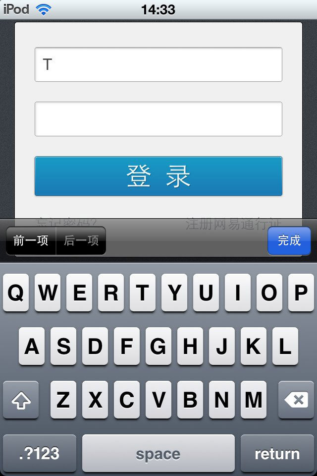 (3) iPhone键盘:程序进入输入功能时,是否正常弹出键盘;键盘的输入法切换:比如从数字到中文到英文到手写模式,是否都能正常自如;键盘上的return键是否正常,比如在下面的登陆框里,输入用户名后按return是否能换行到密码框,输入密码后按return是否能跳转页面。