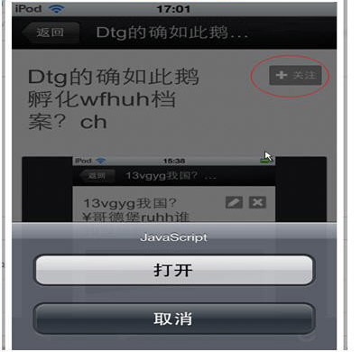 (6)长按某一按钮是否会触发其他事件。比如:长按如下图中的关注按钮,出现了java script的弹窗。