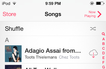▲原生的音乐应用中,会在同一栏的菜单上出现两种大小的字体,和左边的 Store、中间的 Songs 相比,右边的 Now Playing 实在太小了。(中文版没有这个问题)