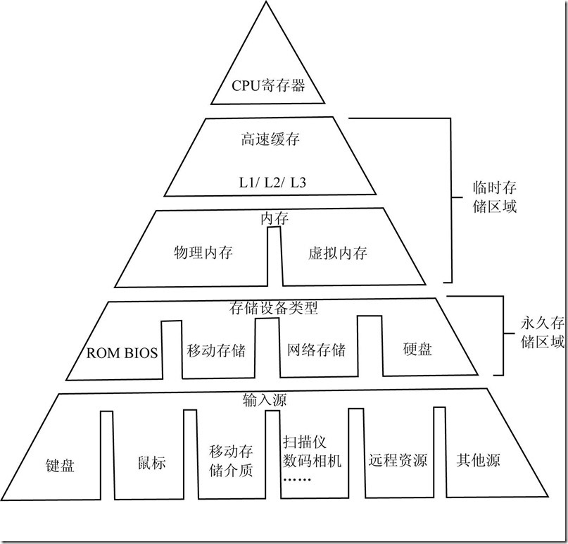 对于计算机来说,存储体系是分层级的。离CPU越近的地方速度愉快,但容量越小(如图1所示)。比如:传统的计算机存储体系结构离CPU由近到远依次是:CPU内的寄存器,一级缓存,二级缓存,内存,硬盘。但同时离CPU越远的存储系统都会比之前的存储系统大一个数量级。比如硬盘通常要比同时代的内存大一个数量级。