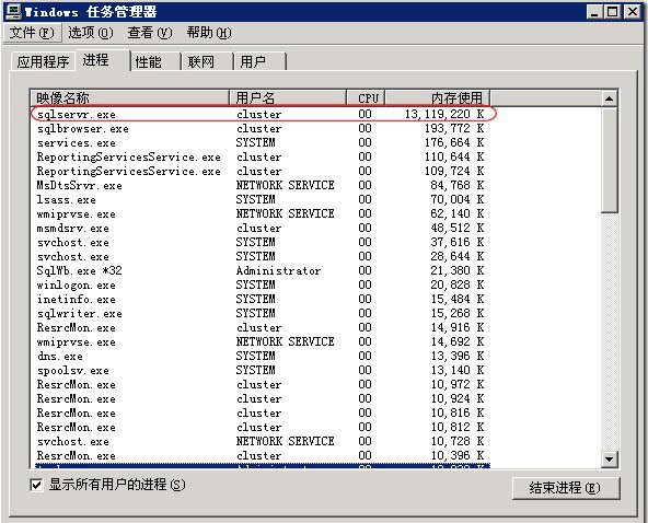 还有一点是,SQL Server使用内存的特点是:有多少用多少,并且用了以后不释放(除非收到Windows内存压力的通知)。比如我所在公司的开发服务器,在几乎没有负载的时候来看内存使用,如图3所示。