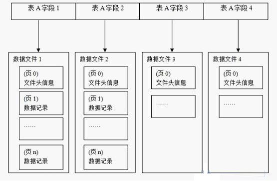 列数据库的数据一般以文件的形式存储在磁盘中,每个表的每个字段的记录会存在不同的文件中,在进行数据的增删查改操作时需要进行文件的IO操作。在列数据库存储数据时,关系表中的数据将会按字段来分别存储,同一字段的数据段被存在同一个文件中,不同字段的数据段被存在不同文件中,如下图所示。