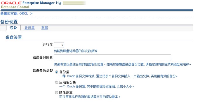 可以设置一些与Oracle数据库相关的设置以及备份策略。比如:可以设置传输到磁盘驱动器的并发数据流,可以根据数据库服务器的CPU配置来设置其磁盘备份的并行度,如果有若干个CPU,可以适当的提高并行度;如果不希望Oracle将快速恢复区作为磁盘备份位置,可以通过设置告诉Oracle将备份放在指定的磁盘备份位置;可以从三种磁盘备份类型中选择:备份集(一种Oracle备份文件格式,通过将多个备份文件插入到一个输出文件,实现更有效的备份)、压缩备份集(一个Oracle备份集,其中的数据经过压缩,以减少大小)、映像副本(可以原样的执行恢复时候的数据库文件的逐位副本)。