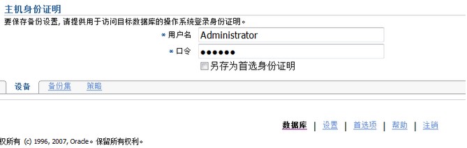 Oracle Em,在进行备份和恢复的配置的时候,需要调用本地服务器的资源,因此需要输入本地服务器的操作系统的认证用户名和密码,提供主机身份证明。如下: