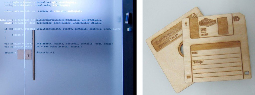 (你不需要一家华丽的办公室来留下美好的印象——细节往往决定成败。我们的入口贴着代码,我们的定制杯垫则做成了磁盘的形状)