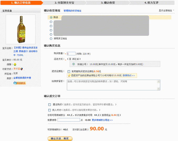 我们用淘宝的“购买商品”来举例说明怎么划分逻辑事务,先来看购买商品的页面:
