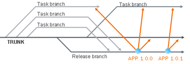 此种模式在采用敏捷开发模式(例如Scrum)的项目中广泛采用,这些项目有固定的迭代周期(例如Scrum中每个Sprint的两周时间),新的功能开发都在Task branch(Feature branch)上进行,在接近迭代周期的发布阶段时候,新建Release branch来完成本迭代周期的发布,各Task branch(Feature branch)的功能merge到Release Branch中。在完成发布后,Release branch的功能merge到Trunk和尚在进行的Task branch中。