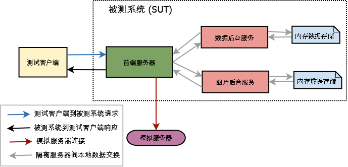 需要注意的是图中到模拟服务器的连接在这个测试中并不需要。如果被测试的请求需要连接这个后端服务,我们需要在这个连接点也提供一个隔离式服务器。