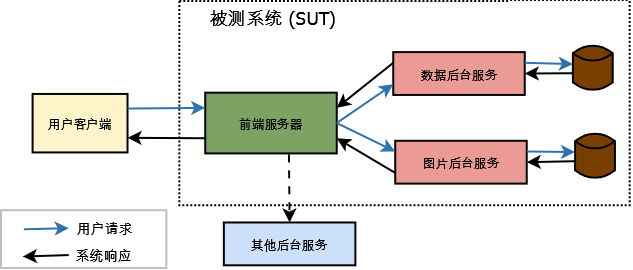 在 Google 测试世界里,端到端测试是指作用于从用户请求到响应的整个流程和全部服务器集群的测试。下面是一个简化的由端到端测试所涵盖的被测系统 (SUT) 的示意图。注意图中被测系统的的前端服务器连接到了一个第三方后台服务器,但是这个第三方服务器并不被图中特定的用户请求所使用。