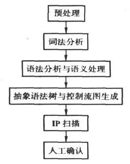 测试过程从源代码输入开始,经历预编译、词法分析、语法分析与语义处理、抽象语法树生成、控制流图生成和IP 扫描等几个步骤,后自动生成IP报表。检测流程如图1所示。