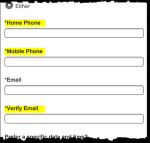 1. 限制必填部分的输入。正如LUKE WROBLEWSKI在著作《移动为先》( MOBILE FIRST)中提到的那样,“涉及到移动设备上的表格,需要残忍而有效地减少,减少,再减少。”限制登记表,使其只包含少的必填部分,可能情况下,替换为更短内容。比如,使用ZIP号码,而不是城市和。针对这个规范,我喜欢举的反例是大众的试驾预约表格,移动版必填的字段居然比桌面版还多(高亮部分显示为多余字段):