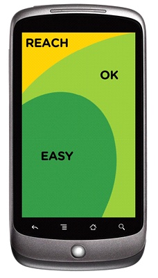 2. 在触摸屏上,确保点击对象的尺寸和位置以避免误操作。另外,将点击对象放在合适的区域,比如:把“删除”等具有破坏性的功能对象放在下图所示的“Reach”区域,Luke Wroblewski在《移动为先》(Mobile First)中提及。