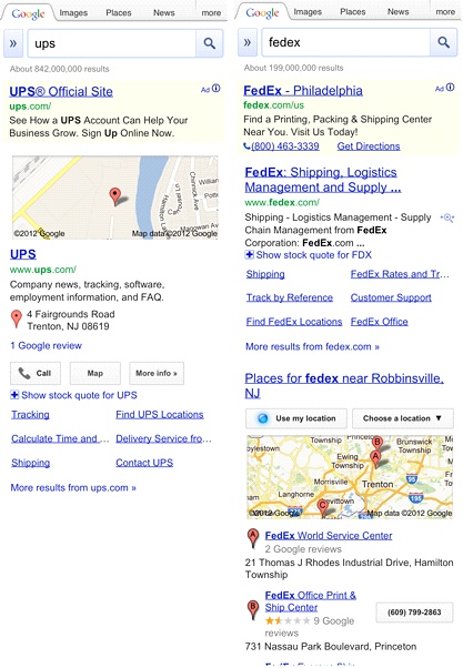 1. 通过优化移动端搜索和发现来确保产品的可寻性,比如保持URL简短。如果你有一个独立的移动网站,请遵循URL命名约定(m.site.com或mobile.site.com)。在移动搜索结果里,提供快速访问本地的内容的入口(如当前位置的方向)以及系统自带功能(比如点击快速拨号)。