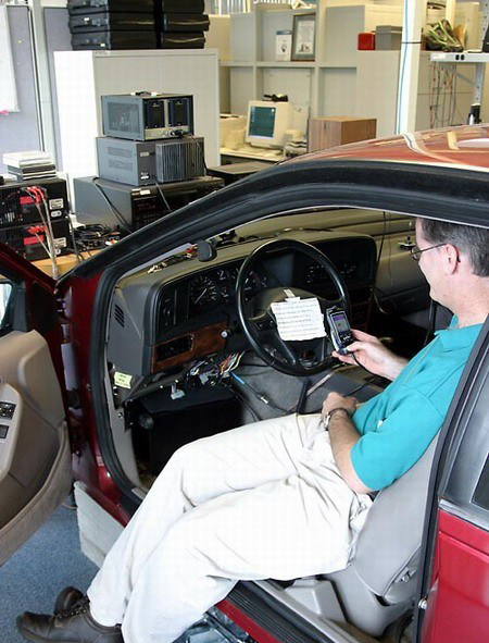 汽车也开进了实验室,这是做什么用的呢。原来是要测试在驾驶汽车的过程中对手机通话质量的影响,这是一辆1992年产的水星美洲豹,目的是为了模拟真实的环境从而获得更真实的测试数据。汽车测试需要测试手机对音响和路面噪音的抗干扰能力。音响测试使用的是汽车自带的音响,路面噪音是依靠NTT DoCoM提供的一个路面噪音的拷贝,照片上汽车方向盘下方那个黑色的箱子是播放汽车噪音拷贝的扬声器。