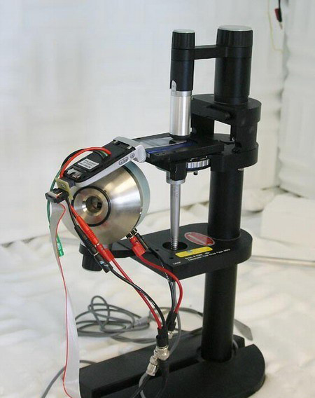 下面图片中的设备有两个功能,一个是测试手机麦克风的录放幅频响应,一个是测试手机的听筒。首先是播放一段录音,然后电脑分析器纪录下通过麦克风后接收到的振动频率,分析后显示出与播放录音的比较,还原性越高说明手机麦克风对声音的捕捉能力越高。