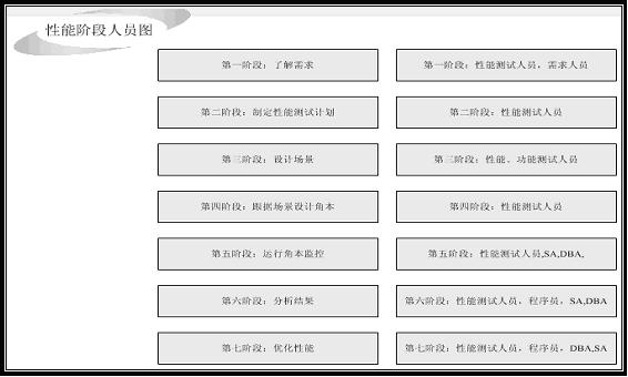 在性能测试的每一个阶段,性能测试的参与人是不一样的,下面的图是不同阶段的人员参与表。
