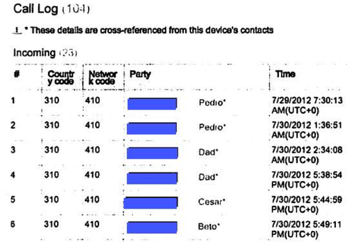 美国移民与海关执法局人员缴获的一部iPhone的通话记录,包括电话号码