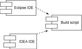 我们要清楚:使用 IDE 来执行构建并没有错,但是 IDE 不应该成为能构建软件的惟一环境。特别是,一个完全用脚本编写的构建,可以使开发团队能够使用多种 IDE,因为只存在从 IDE 到构建的依赖性,而不存在相反方向的依赖性,如图 1 所示: