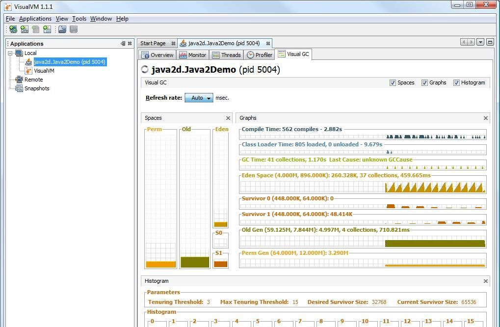 这里简单介绍一下jvisualvm吧,真的是一个内存分析的利器。使用后发现真的非常强大,特别是visualgc的插件,界面如下: