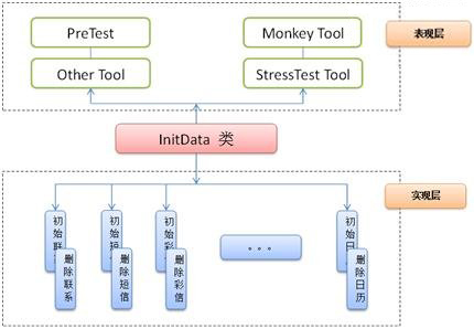 工具是经典的两层架构,如下图,实现层是负责各类应用具体数据初始化实现的,包含联系人的创建,短信/彩信的初始化等等,表现层是在实现层jar包(InitData类)的基础上,实现的和用户进行交互的界面。实现层与表现层的分离为后续实现层的复用提供了条件。
