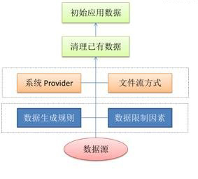 初始化数据的第一步当然是准备数据源,然后跟进先前制定的数据生成规则,在一定的系统环境因素约束下,生成一系列个性化的初始化数据,后利用系统Provider或文件流交互的方式把生成的数据放到应用中,下图给出工具实现的逻辑示意图: