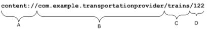 初始化数据的第一步当然是找到被初始化的应用标识符,android系统中的每一个Content Provider都有一个的名字,它是其它应用和该Provider交互的一种便捷途径。上图是一个Provider的通用表达,其中A表示标准前缀,B表示URI,C是具体路径,D是URI中的某个数据ID(如果存在的话)。