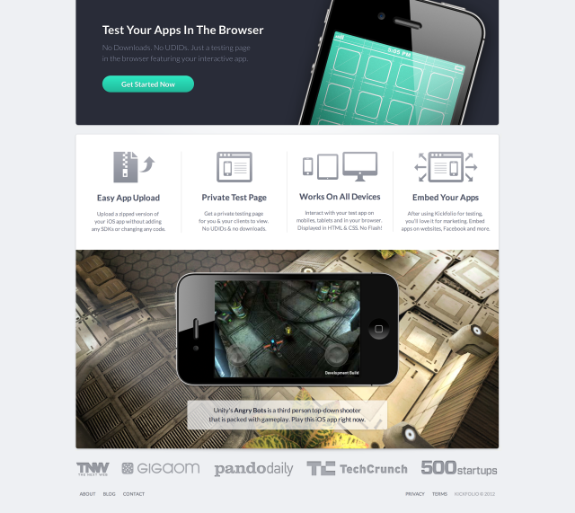 可以让开发者在浏览器上测试其iOS应用的Kickfolio正式对开发者开放。Kickfolio是一家500 Startups资助的初创企业,跟Facebook收购的Pieceable或面向Android的Appsurfer类似,他可以让开发者上传移动应用的编译模块到Kickfolio的平台上,然后可以让其他人在web上与app交互,无需下载测试执行代码到移动设备上即可进行测试。