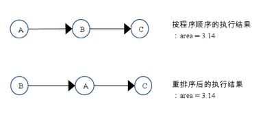 如上图所示,A和C之间存在数据依赖关系,同时B和C之间也存在数据依赖关系。因此在终执行的指令序列中,C不能被重排序到A和B的前面(C排到A和B的前面,程序的结果将会被改变)。但A和B之间没有数据依赖关系,编译器和处理器可以重排序A和B之间的执行顺序。下图是该程序的两种执行顺序: