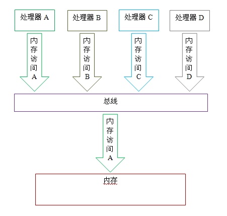 如上图所示,假设处理器A,B和C同时向总线发起总线事务,这时总线仲裁(bus arbitration)会对竞争作出裁决,这里我们假设总线在仲裁后判定处理器A在竞争中获胜(总线仲裁会确保所有处理器都能公平的访问内存)。此时处理器A继续它的总线事务,而其它两个处理器则要等待处理器A的总线事务完成后才能开始再次执行内存访问。假设在处理器A执行总线事务期间(不管这个总线事务是读事务还是写事务),处理器D向总线发起了总线事务,此时处理器D的这个请求会被总线禁止。