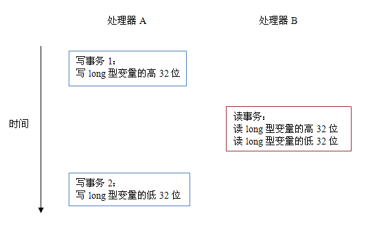 如上图所示,假设处理器A写一个long型变量,同时处理器B要读这个long型变量。处理器A中64位的写操作被拆分为两个32位的写操作,且这两个32位的写操作被分配到不同的写事务中执行。同时处理器B中64位的读操作被拆分为两个32位的读操作,且这两个32位的读操作被分配到同一个的读事务中执行。当处理器A和B按上图的时序来执行时,处理器B将看到仅仅被处理器A“写了一半“的无效值。