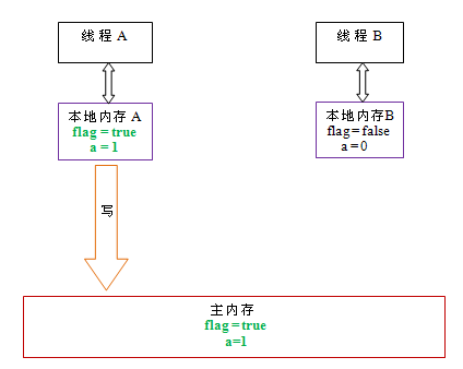 如上图所示,线程A在写flag变量后,本地内存A中被线程A更新过的两个共享变量的值被刷新到主内存中。此时,本地内存A和主内存中的共享变量的值是一致的。