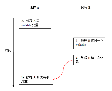 在旧的内存模型中,当1和2之间没有数据依赖关系时,1和2之间可能被重排序(3和4类似)。其结果是:读线程B执行4时,不一定能看到写线程A在执行1时对共享变量的修改。