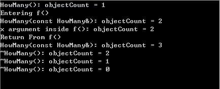 4、进入f()函数,在执行“return x”语句后,调用拷贝构造函数,将对象Temp的内容拷贝到h2中(完成了h2 = f(h)的工作)