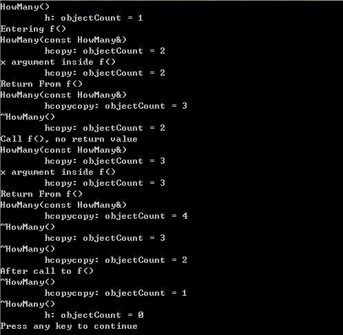 4、进入f()函数后,在“return x”时,调用拷贝构造函数,将对象Temp的内容拷贝到h2中,在函数结束前调用析构函数,销毁对象Temp