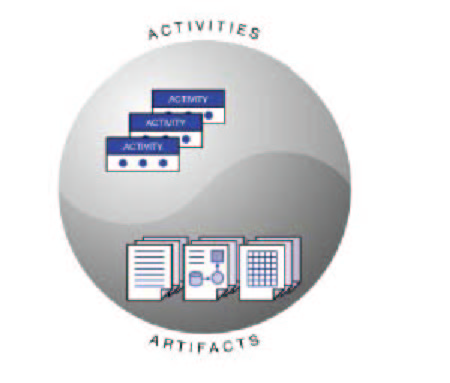 随着软件系统和开发团队在规模和复杂性上的不断增长,对开发团队来说如何围绕周期性的版本发布来合理地组织开发活动以及高效地管理用于实现这些活动的工件变得日益重要。活动(activity)可以是在现有产品中修复一个缺陷或者新加一个增强功能。工件(artifact)可以是在开发生命周期中涉及的任何东西,例如需求文档,源代码,设计模型或者测试脚本等。实际上软件开发过程是软件开发团队执行活动并生产工件(图1)。UCM集成了由Rational ClearQuest提供的变更请求活动管理和Rational ClearCase提供的工件管理功能。