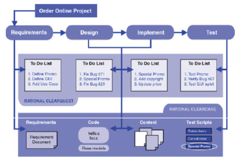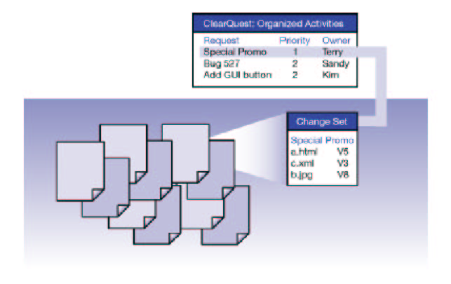 为了高效地通信和协作工作,开发团队成员需要有效地共享这些工件。Rational Suite包含有一个集成平台,通过这一公共平台可以访问贯穿多个领域的所有类型的开发工件。作为Rational Suite的一部分,UCM提供了一个用于管理贯穿软件开发生命周期的信息共享的过程层。现在每个Rational Suite产品套件中均包含了这两个产品,这样每个Rational Suite产品都包含了对UCM过程的支持。非软件开发人员(如分析人员、设计人员以及测试人员)可以应用UCM原理象控制代码变更一样来控制他们生产的工件(如需求文档,用例,设计模型,测试脚本及测试数据)。Rational ClearQuest工作流引擎强化了活动管理,另外一致的工作流使得所有的团队成员都可以容易地标识优先级,而ClearQuest提供的工作列表(to do list)特性可以使每个人均可从他们的桌面透明访问待进行的工作(活动)列表,从而容易地标识出他们下一步需要进行的工作。同样构件基线是新工作(分析、设计、开发及测试)的基础并指导团队成员什么时候更新他们工作空间。