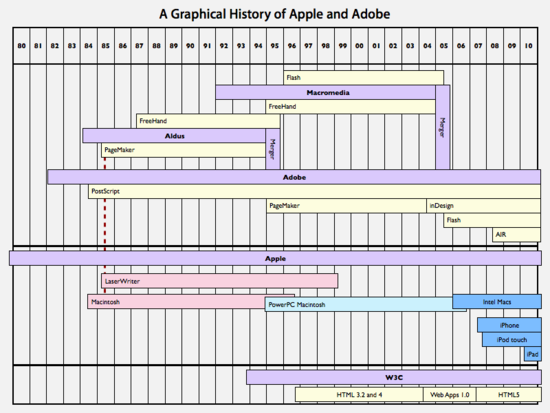 此外,林奇并非曾在此前的职业生涯中支持Flash的苹果高管。苹果现任全球营销高级副总裁菲尔·席勒(Phil Schiller)曾担任Macromedia的产品营销副总裁,在该公司于1996年从初的开发商FutureWave那里收购Flash时曾为其提供支持。次年,席勒从Macromedia离职,加盟由乔布斯重新执掌后的苹果。但回头看看Macromedia的时代,当时一系列产品都曾引起这家公司的关注,从直接与Adobe相连的打印工具,到当时初出茅庐的视频编辑软件KeyGrip(这个软件是由Adobe Premier的创造者兰迪·尤必罗斯(Randy Ubillos)开发的,而现在尤必罗斯是苹果的首席视频应用架构师),再到Flash和Dreamweaver等以网络为中心的工具等。