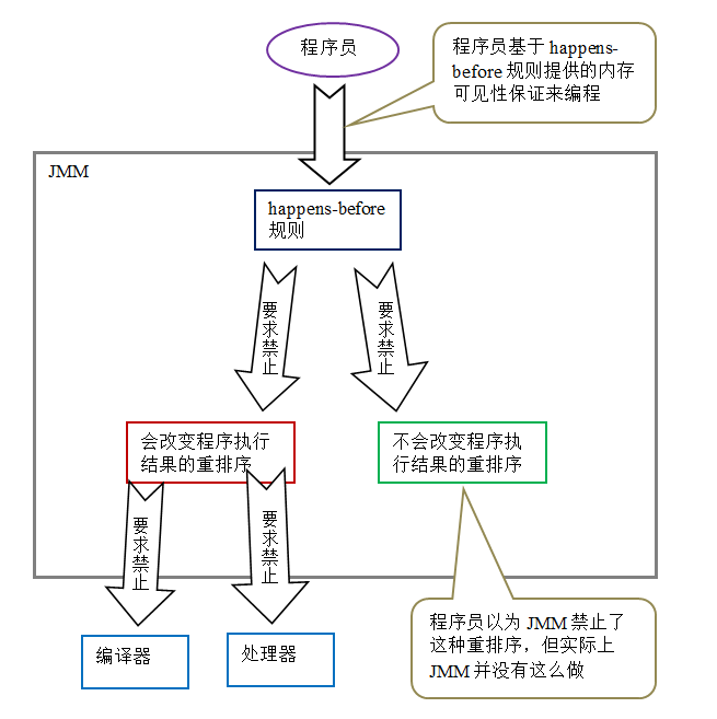 ● JMM向程序员提供的happens- before规则能满足程序员的需求。JMM的happens- before规则不但简单易懂,而且也向程序员提供了足够强的内存可见性保证(有些内存可见性保证其实并不一定真实存在,比如上面的A happens- before B)。