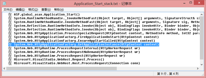 Global.asax的Application_Start事件处理器的调用方式则不同,ASP.NET采用了反射调用,当异常发生只保留了内部异常,我们看不到调用堆栈(不信的话,自己去试试)。